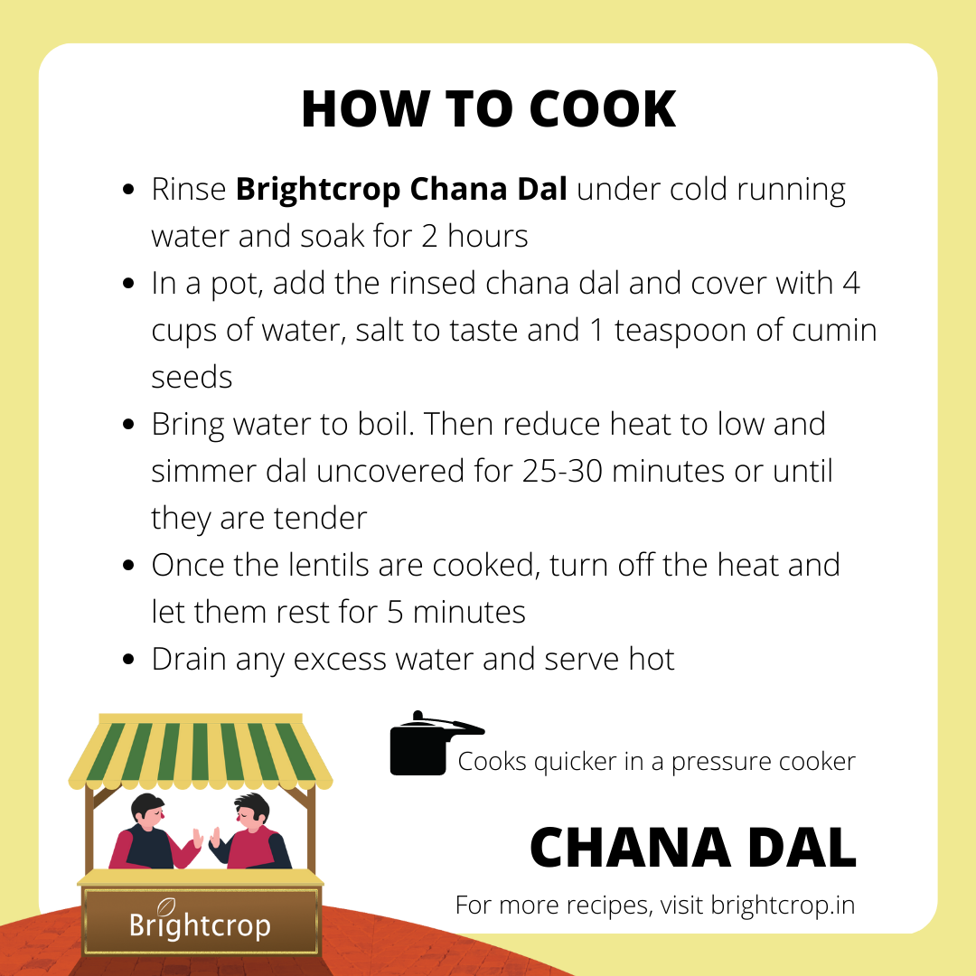 Nutrient benefits: Brightcrop Chana dal is highly nutritious and rich in protein, dietary fiber, vitamins (such as folate, vitamin B6), and minerals (including iron, manganese, phosphorus, and zinc).