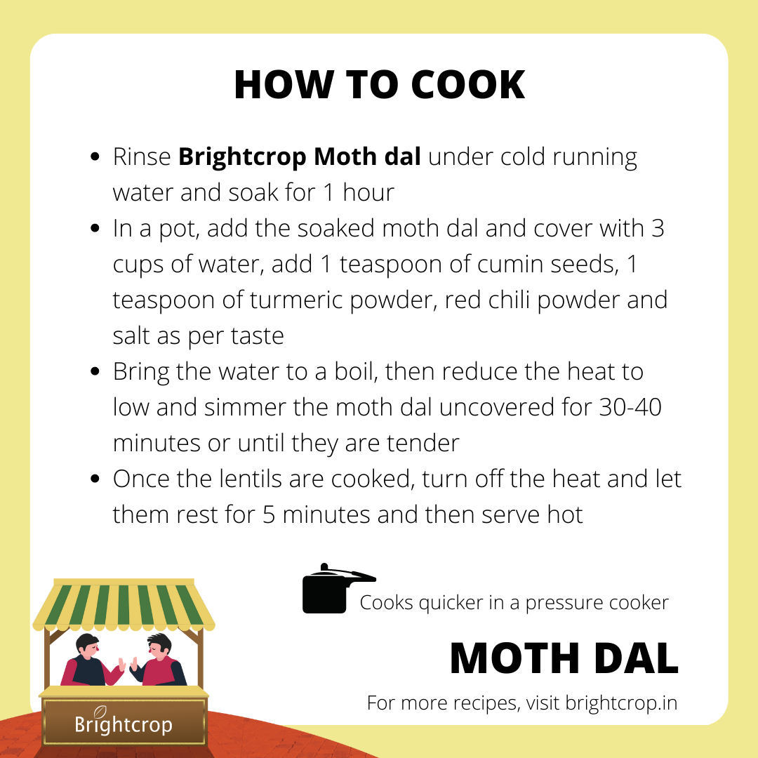 Description: Brightcrop Moth dal (Matki) is small and elongated bean with a brown skin and a brownish-yellow interior. Matki or moth beans are known for their nutty flavor & used to make various indian cuisines.