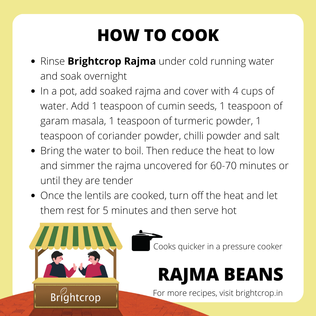 Description:Â Brightcrop Rajma beans are large and have a unique shape resembling a kidney and have a dark red color. Rajma beans have a firm texture and hold their shape well during cooking. Due to their texture, they are often used in soups and curries.